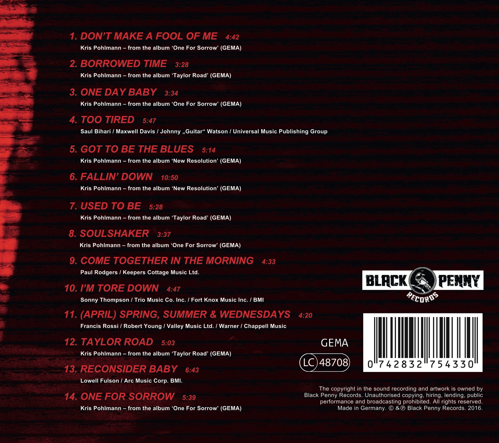 That passion can be heard throughout the album. Right from the opening of ‘Don’t Make A Fool Of Me’ and ‘Borrowed Time’ the band can be heard enjoying itself and joking with the audience between songs. The set list itself is a journey through Kris Pohlmann’s three studio albums featuring the pile-driving songs ‘Got To Be The Blues’ as well as a rousing ten minute version of ‘Fallin’ Down’ from ‘New Resolution’ which Kris regards as the best ever version of that song. ‘Used To Be’ and crowd favourite, ‘Taylor Road’, are amongst the ‘Taylor Road’ album songs that are captured live with even more power than the studio album versions. As with any Kris Pohlmann concert the blues can be heard in its purest form. ‘One Day Baby’ from the 2012 release ‘One For Sorrow’, as well as cover versions of Johnny Guitar Watson’s ‘Too Tired’, ‘I’m Tore Down’ written by Sonny Thompson and made popular by Kris Pohlmann’s favourite blues artist Freddie King, and Lowell Folsom’s ‘Reconsider Baby’ provide further album highlights. The captivating instrumental ‘One For Sorrow’ closes the album to rapturous applause.