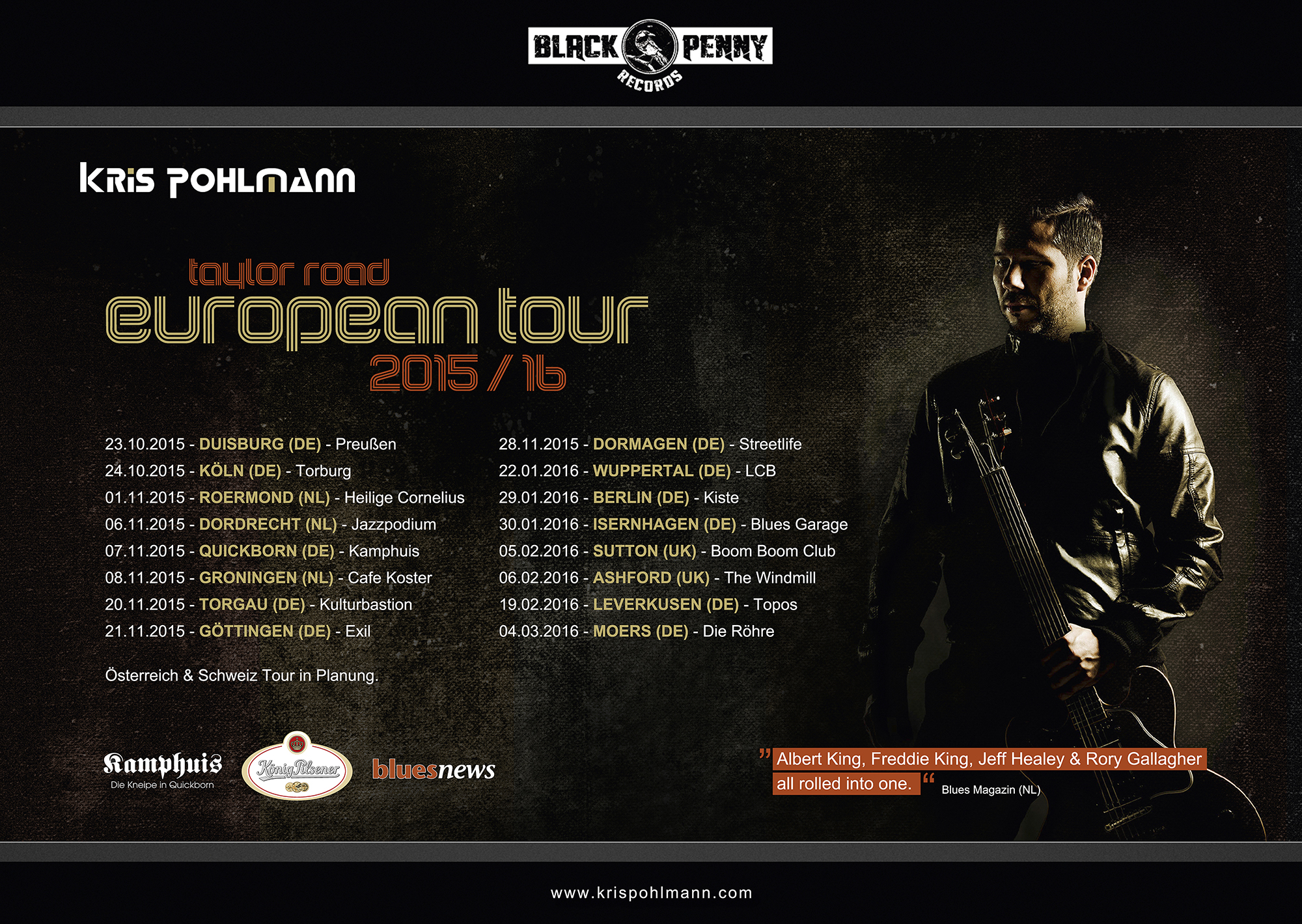 The european tour is about to kick off! On 23rd October I’ll be heading to Duisburg for the first concert of the 2015-2016 winter european tour. Joining me will be my new bass player Jonas Bareiter and drummer Janosch Brenneisen! Over the next months we’ll be touring through Germany, The Netherlands and England visiting some of our favourite clubs and playing at some new venues! We’ll be seeing some familiar faces and making some new friends & fans along the way! We’ve put together a very blues oriented set list, exploring some of my favourite blues artists as well as playing some of my older blues songs. Of course, this is still part of the ‘Taylor Road’ promotion, so expect a few heavier tracks from this album too! Anyway, I can’t wait to get out there again and hope to see you all ‘further on down the road’.